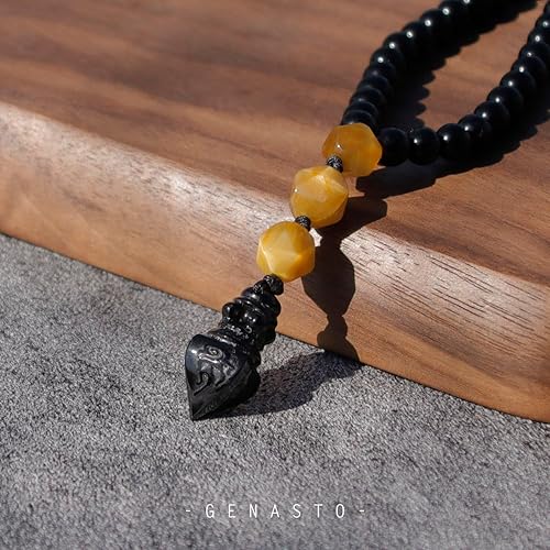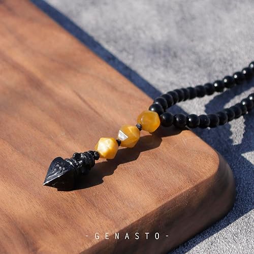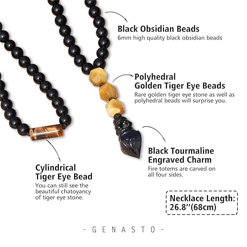 GENASTO obsidian necklace is designed in a traditional style. The main part of this men's beaded necklace is made from obsidian beads joined together using 108 beads in total with 7 faceted gold tiger eye. At the bottom of the necklace falls an implement pendant carved from a black tourmaline stone with fire totems engraved on all sides that add more detail to the whole men's crystal necklace. Perfect to wear as an everyday adornment or for prayer and meditation.