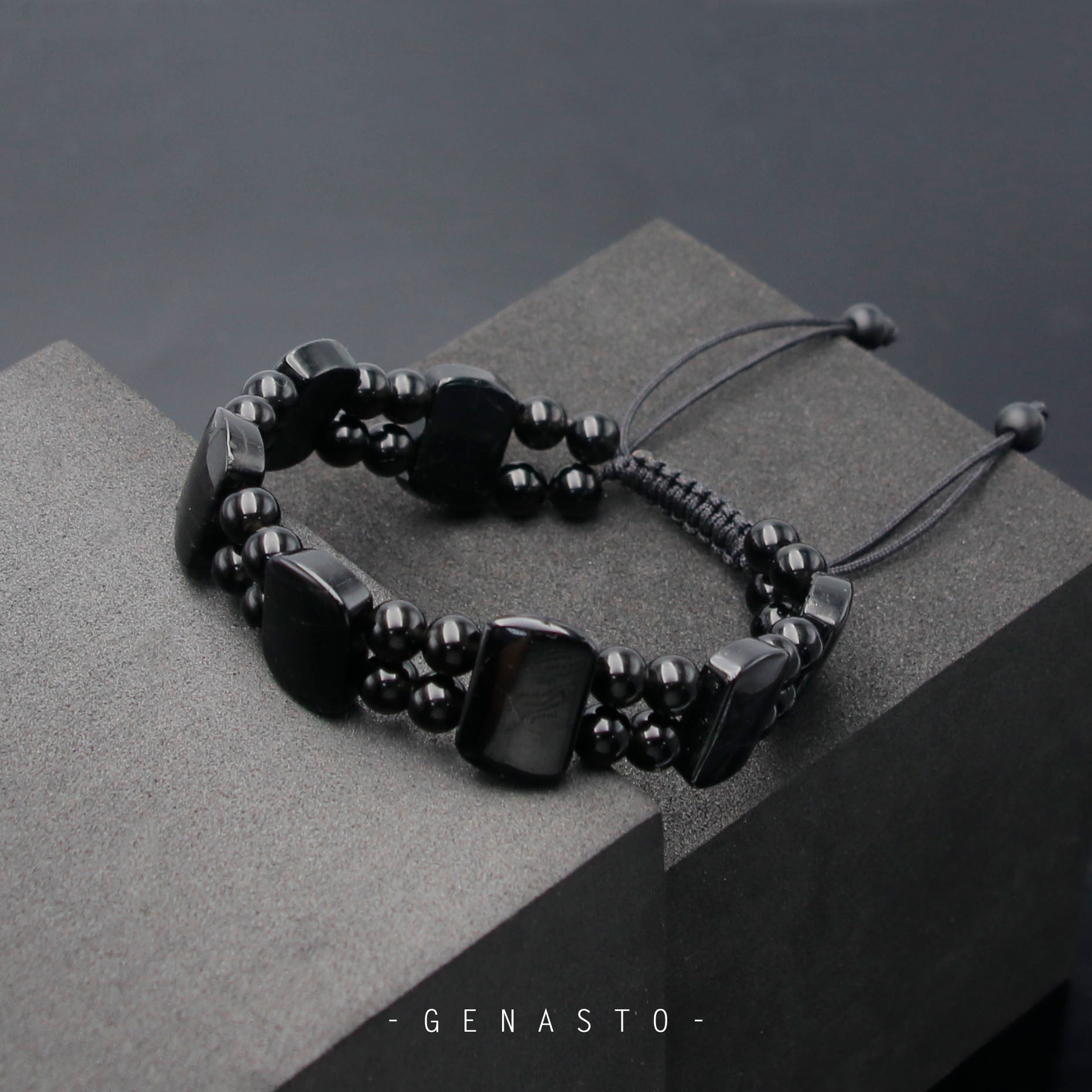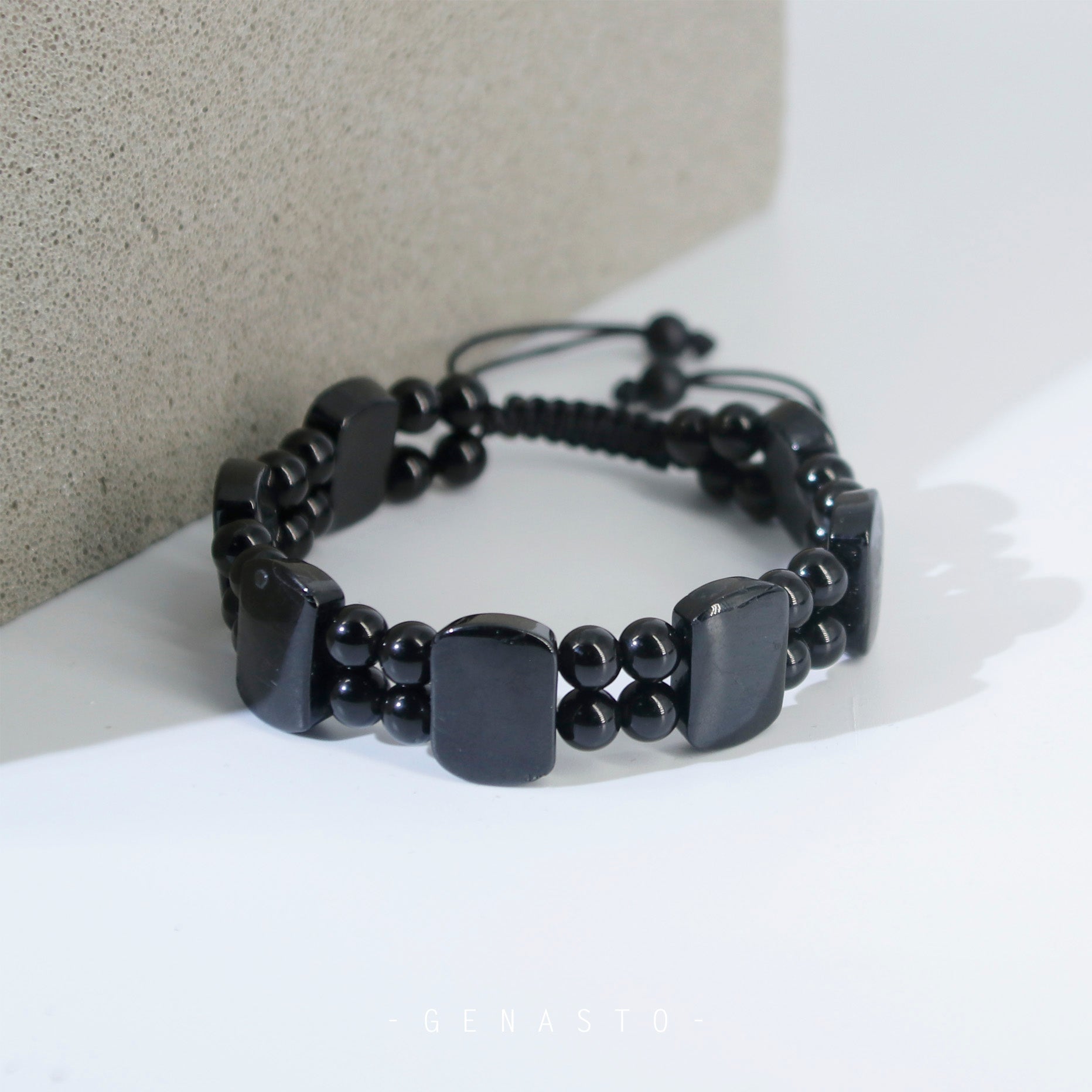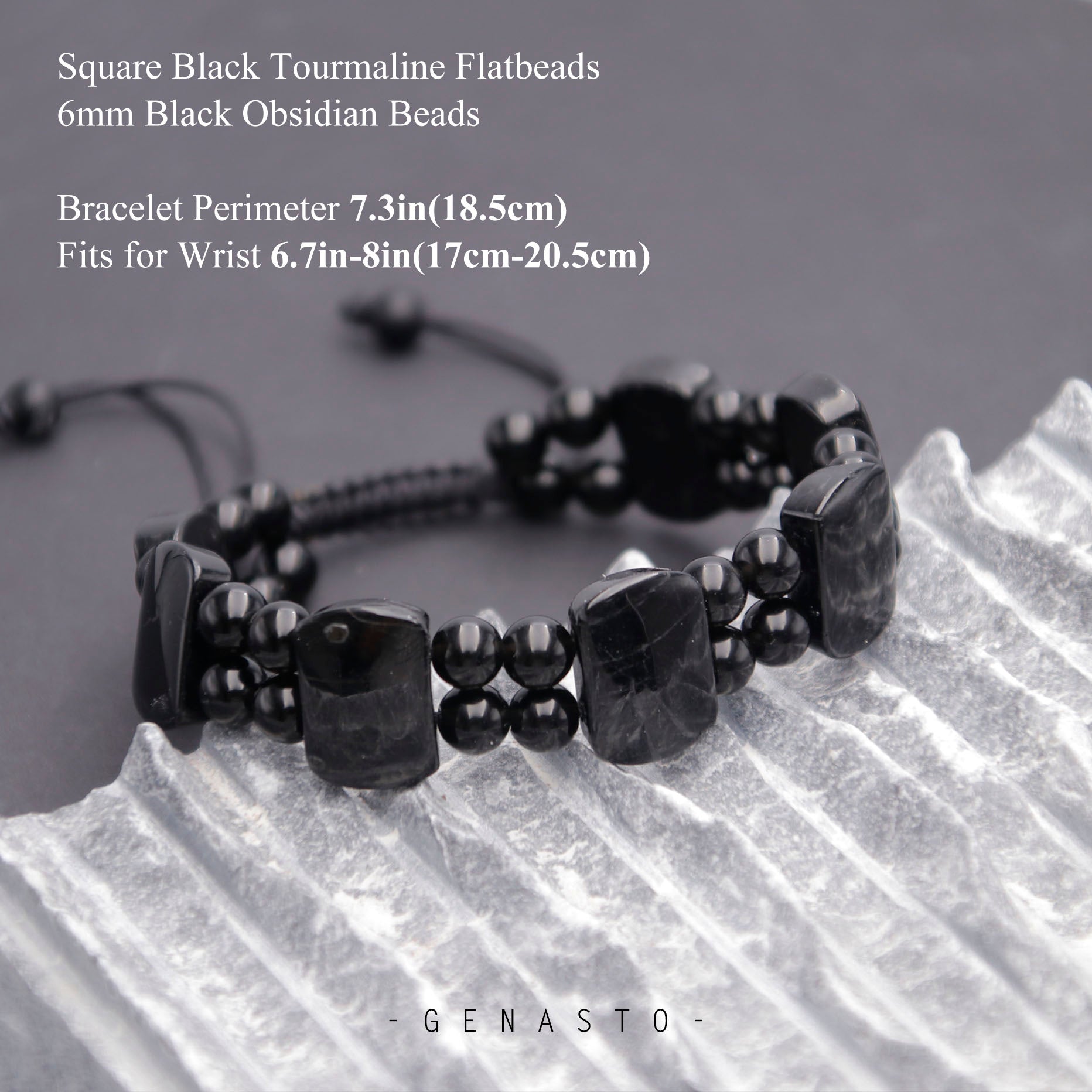 Black Tourmaline & Black Obsidian Square Flat Beads Bracelet
