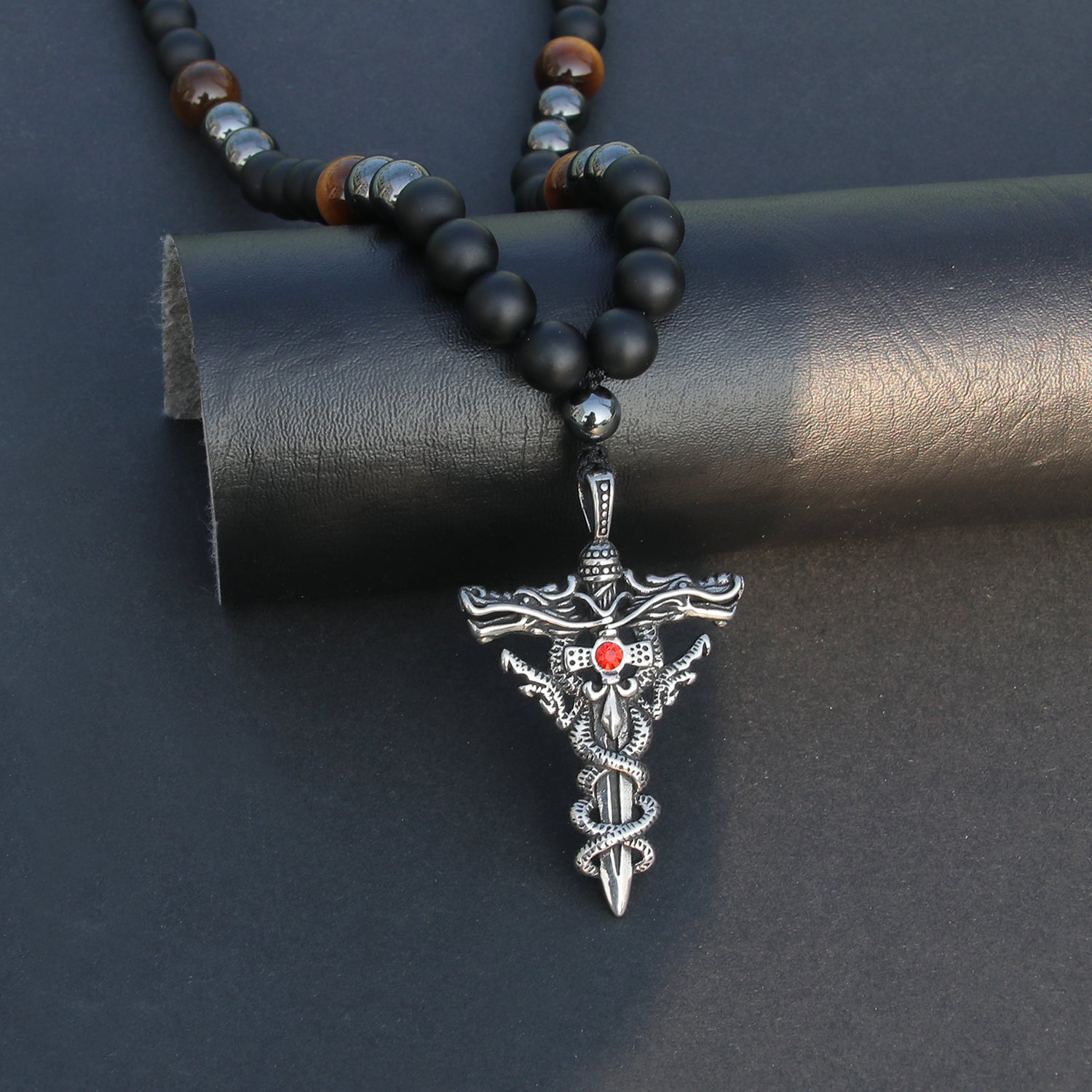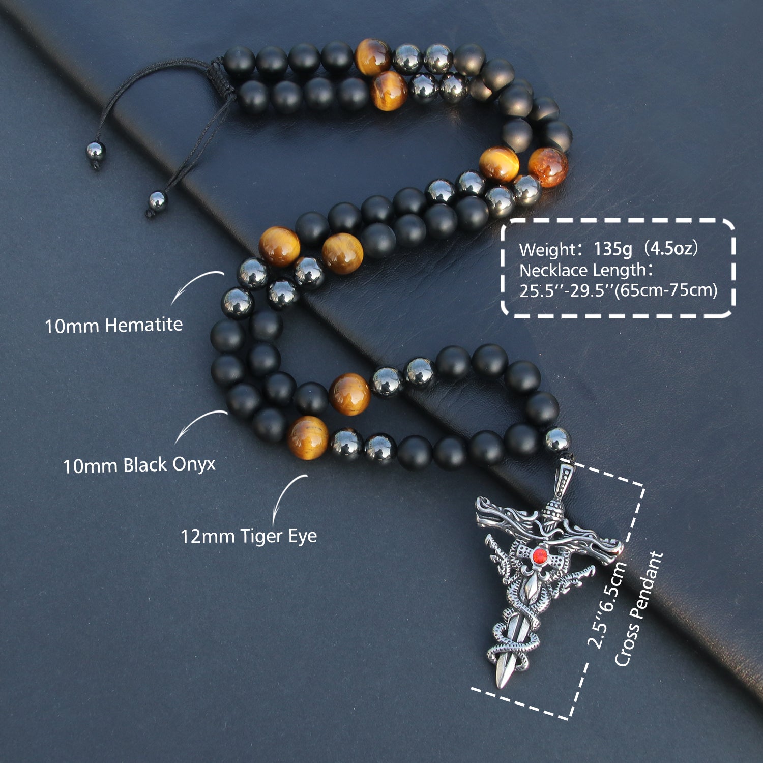 Elevate your spiritual practice and style with the GENASTO Protection Crystal Tiger's Eye Necklace. Designed with a meaningful combination of healing stones, this men's necklace features a 2.5-inch (6.5cm) cross pendant as the centerpiece, offering both a powerful symbol of faith and a grounding energy. The necklace is meticulously crafted with 10mm Hematite beads, 10mm Onyx beads, and 12mm Tiger's Eye beads, each known for their unique healing properties and their ability to provide protection, stability, and balance. Specifications: Pendant Size: 2.5’’ (6.5cm) Bead Sizes: 10mm Hematite, 10mm Onyx, 12mm Tiger's Eye Length: Adjustable from 25.5’’ (65cm) to 29.5’’ (75cm) Weight: 135g (4.5oz) Experience the power of these beautiful, healing stones with this unique men's necklace. Perfect for enhancing your spiritual practice and adding a meaningful touch to your everyday look.
