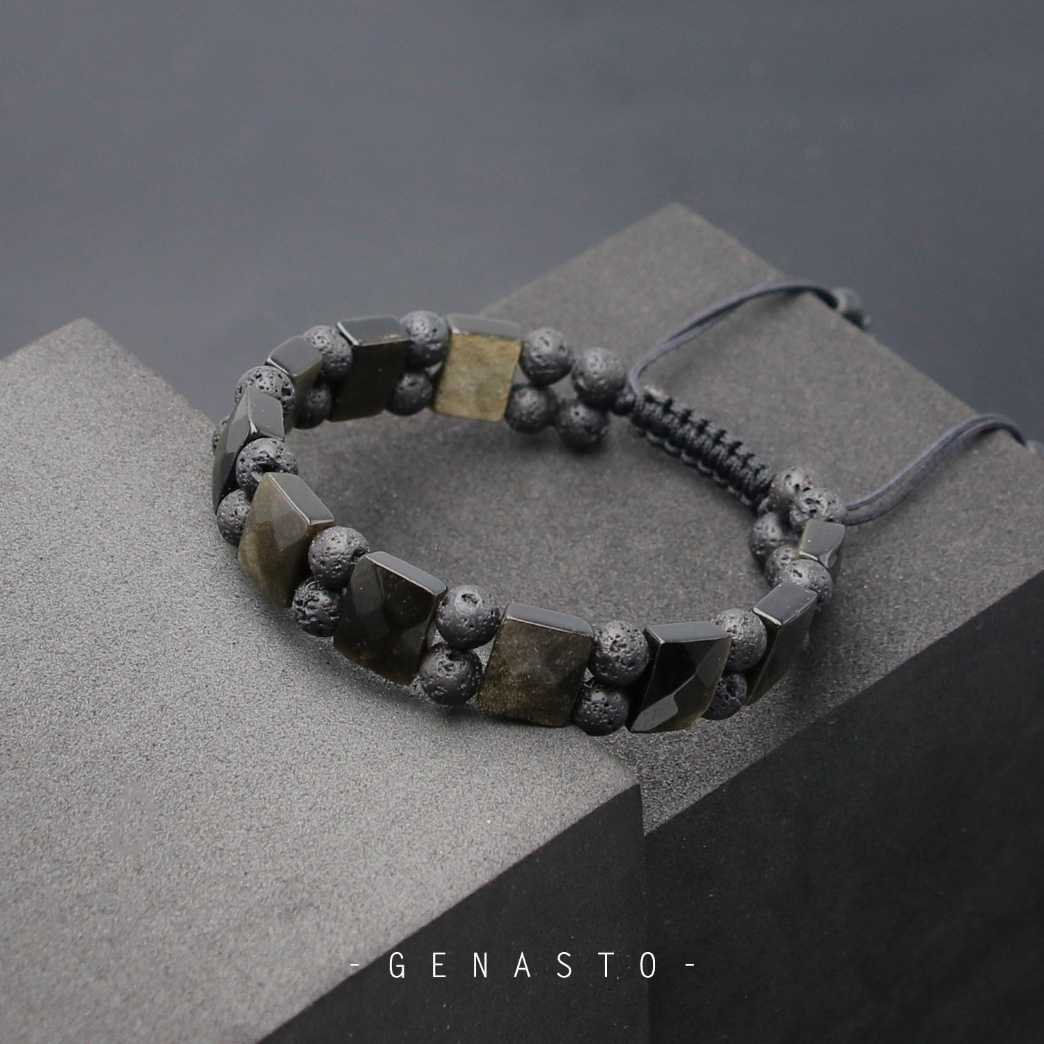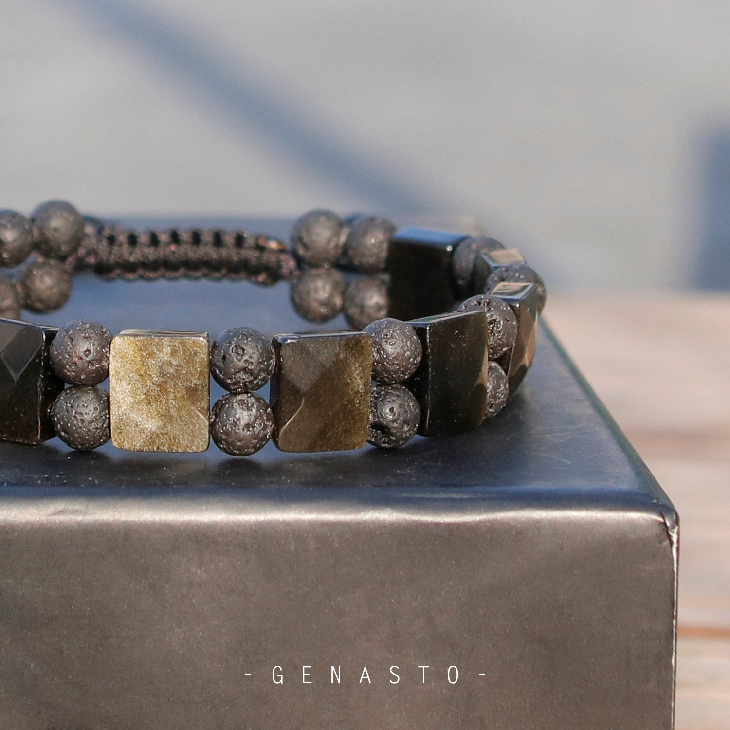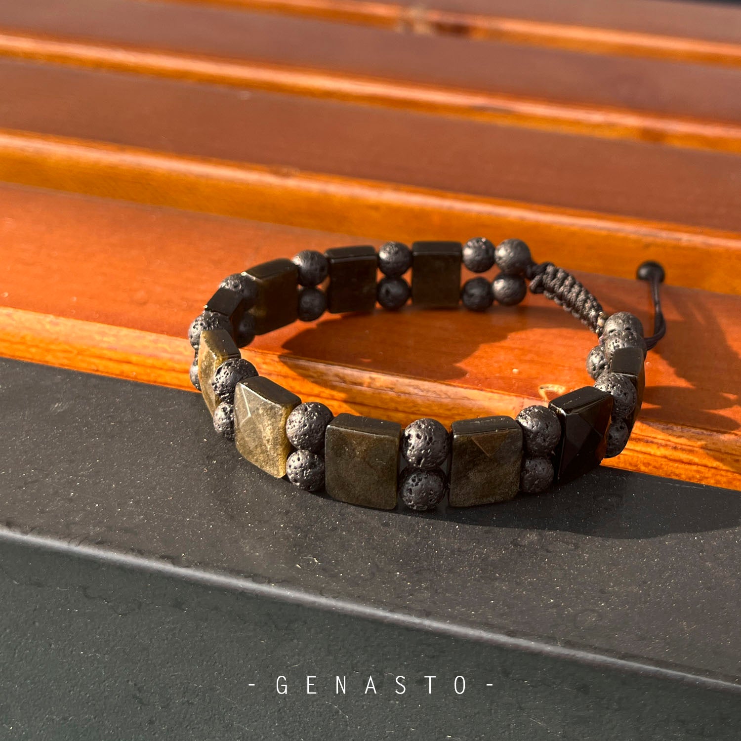 Golden Obsidian & Lava Rock, Square Flat Beads Bracelet