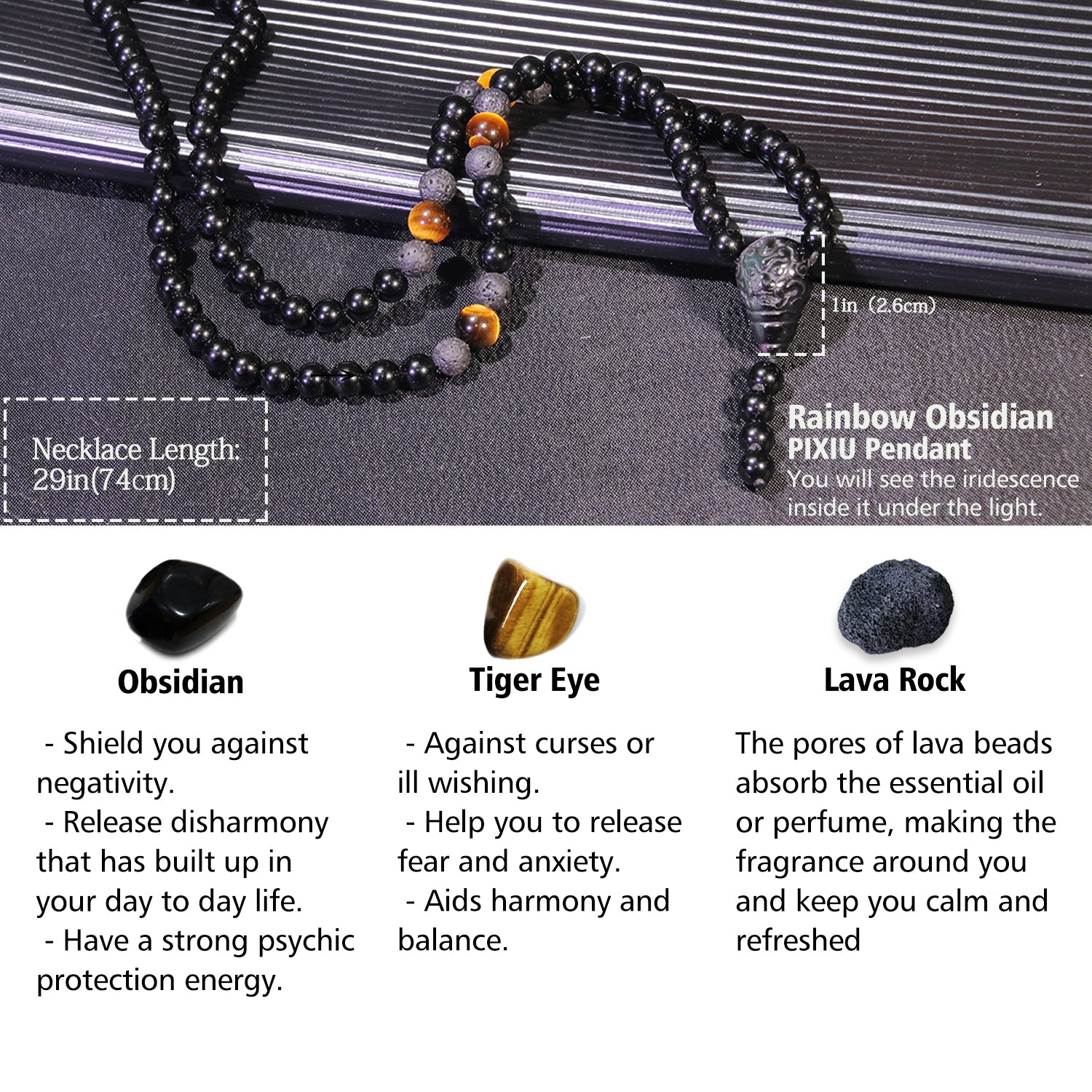 Pixiu is a Chinese mythical hybrid creature, traditionally to the Chinese, Pixiu has always been regarded as an auspicious creature that possessed mystical powers capable of drawing wealth from all directions. Let this black obsidian Pixiu beads necklace be your lucky amulet.The Pixiu Pendant is made of beautiful rainbow obsidian, and when you gently turn the pendant, you can see the rainbow effect on the inside,Carefully selected, using high-quality obsidian, finely polished, bead smooth and delicate.The Pixiu necklace is made of real obsidian, tiger eye, and lava Lava Rock. Obsidian is a powerful healing crystal, tiger eye stone can bring courage and confidence. These three gemstones provide strong protection.